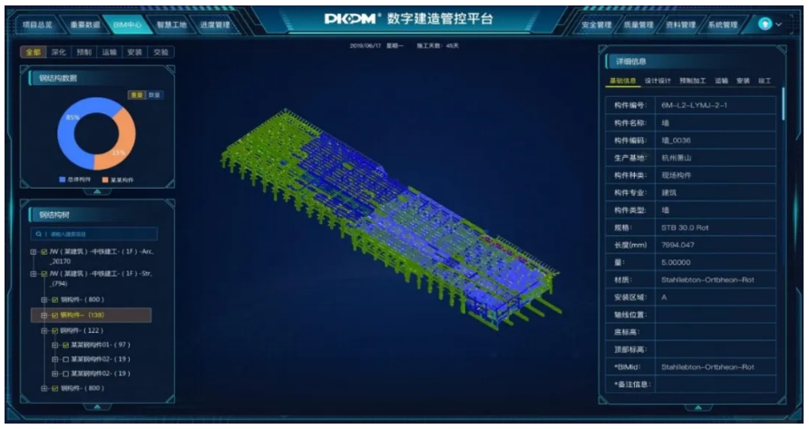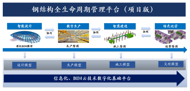 本次發布的“鋼結構全生命周期管理平臺(項目版)”經過多個鋼結構企業和項目調研,在國家“十三五”重點專項建筑工業化課題成果的基礎上,面向鋼結構項目全過程,基于BIM、GIS、物聯網、大數據等技術,實現了鋼結構設計、深化設計、生產、物流、施工、綠色運營、監管等環節的信息共享、多方協同、數據集成,實現了鋼結構項目提質增效、節約成本、縮短工期的目標。