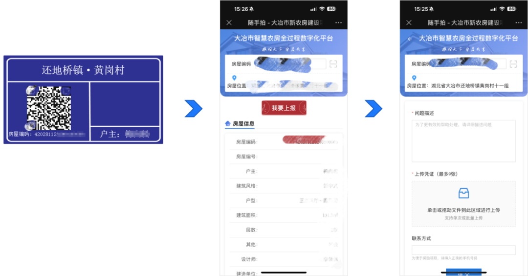 監管系統數據庫可與對應部門數據庫充分對接,為每棟房屋生成專屬的二維碼房牌,實現線上線下一體化管理,為農房安全常態化巡查和定期體檢提供了數據和系統支持。農戶和相關管理人員可通過掃描二維碼上報房屋安全問題,實現農房安全監管“人人參與”。將農戶自查、鎮村排查、縣級巡查、執法檢查,以及群眾監督相結合,能夠及時發現并采取有效措施消除安全隱患。