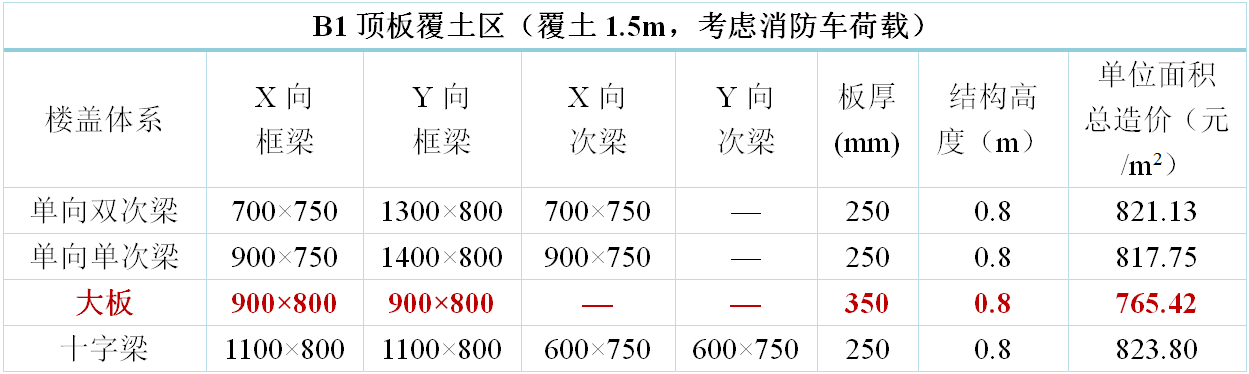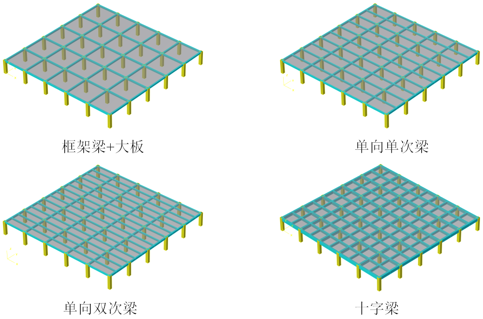 地下室樓蓋方案原則上考慮三種方案布置:主梁大板、單向單次梁、單向雙次梁。其中,地下室頂板增加考慮十字梁方案。