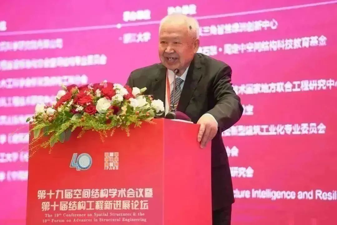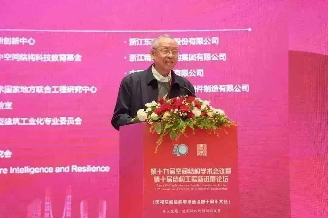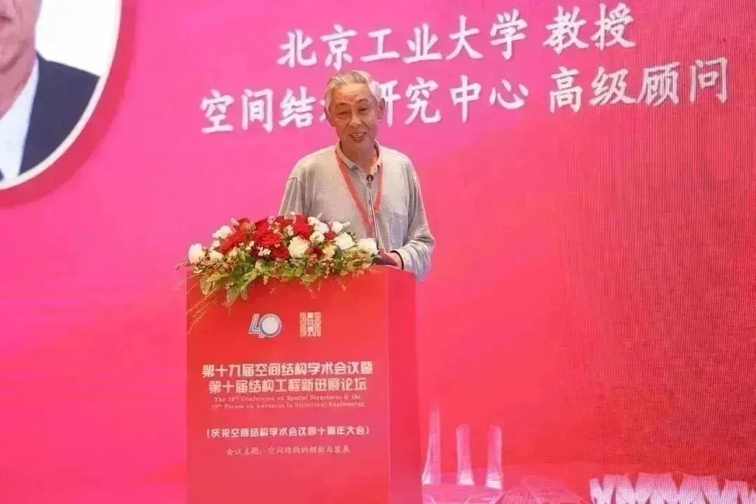中國工程院院士、浙江大學教授、專委會顧問董石麟院士,中國工程院院士、哈爾濱工業(yè)大學教授、專委會顧問沈世釗院士首先發(fā)言,兩位院士向全場講述了空間結(jié)構(gòu)學術(shù)會議從籌備成立之初到如今四十載十九屆的輝煌歷程。北京工業(yè)大學教授、空間結(jié)構(gòu)研究中心高級顧問、專委會資深委員張毅剛,中國建筑科學研究院有限公司研究員、顧問總工程師、專委會資深委員趙基達,全國工程勘察設(shè)計大師、北京市建筑設(shè)計研究院有限公司結(jié)構(gòu)總工、專委會副主任委員朱忠義也先后上臺發(fā)言,分享了和空間結(jié)構(gòu)學術(shù)會議一同成長的感人故事。分享后的獻花環(huán)節(jié),則將慶祝活動推上了高潮,老一輩空間人的先進事跡,一直激勵著新一代人空間人砥礪奮進。