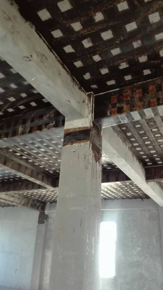 采用PK對屋架進行計算,計算表明,屋架上弦不滿足承載力要求,應進行加固。其他桿件承載力滿足要求。同時檢測報告顯示屋架碳化深度最大為34mm,超出鋼筋保護層厚度,應進行耐久性加固。具體措施為噴涂阻銹劑提高耐久性,同時粘貼碳纖維布進行屋架整體加固