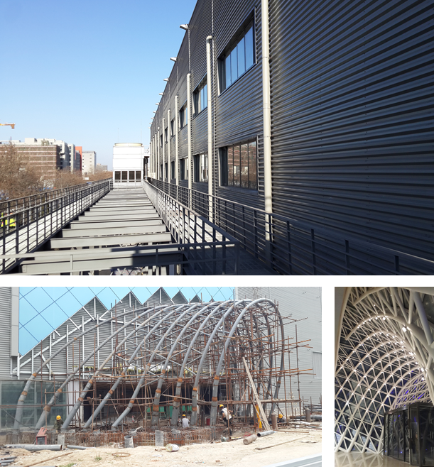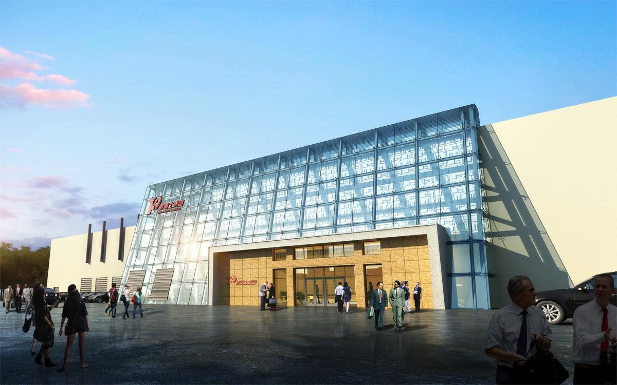 外立面和門頭改造,原外立面裝飾面全部拆除,改造成玻璃幕墻及雙層壓型鋼板復合保溫板(帶造型);門頭采用為單層網殼曲面造型,外表為隱框玻璃幕墻。