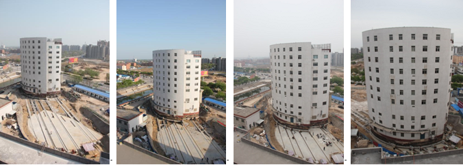 陵縣農(nóng)村信用合作聯(lián)社辦公樓建于1996年,地上八層,地下一層,地上結(jié)構(gòu)采用鋼筋混凝土框架結(jié)構(gòu),現(xiàn)澆鋼筋混凝土樓屋蓋,地下室為鋼筋混凝土箱形基礎(chǔ)。因建筑規(guī)劃調(diào)整,需將該建筑帶地下室整體斜向直線(西北向)平移52.3m。平移時(shí)采用我司研發(fā)的大型結(jié)構(gòu)同步平移控制系統(tǒng)。該工程于201558日滑移就位,滑移實(shí)際工期7天,滑移過(guò)程平穩(wěn)順暢。