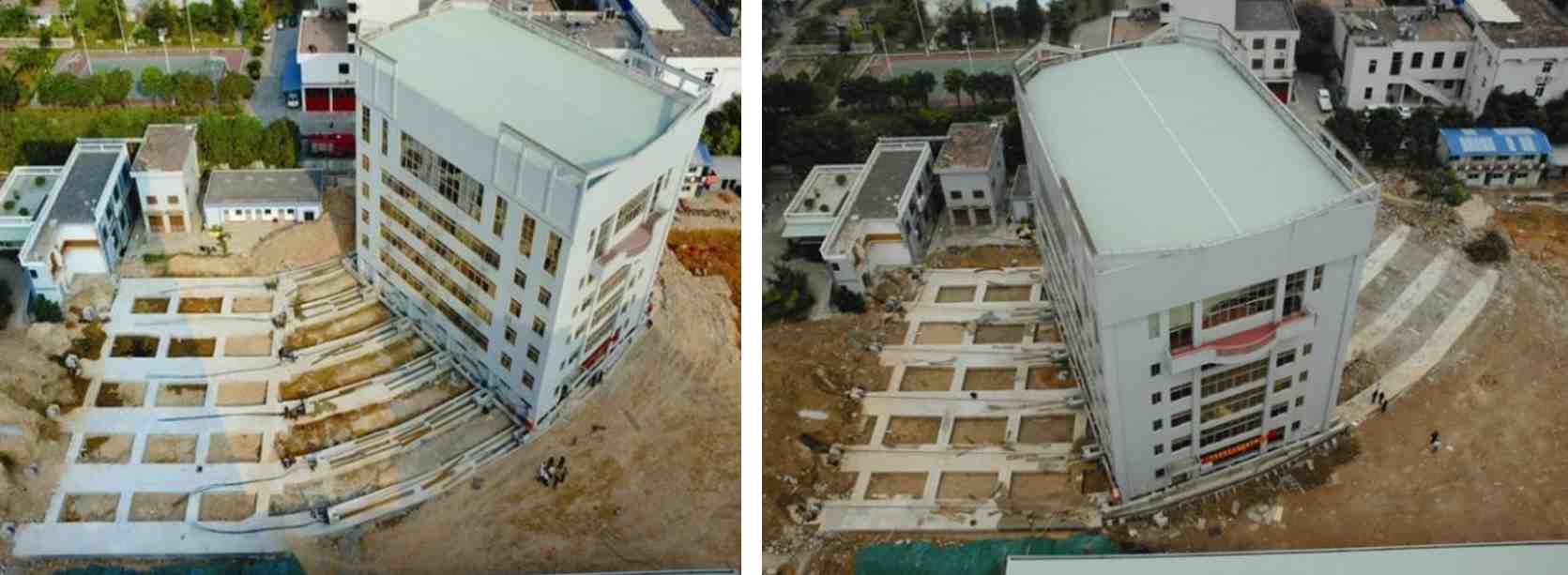 廈門(mén)檢察院技偵大樓主體結(jié)構(gòu)由五層鋼筋混凝土框架和頂部一層鋼結(jié)構(gòu)組成。該建筑長(zhǎng)32m,寬21m,總建筑面積約4000㎡。該樓沿圓弧軌道移動(dòng),相當(dāng)于同時(shí)沿其縱向移動(dòng)16m,沿橫向移40.5m,繞形心轉(zhuǎn)動(dòng)45度。該項(xiàng)創(chuàng)新技術(shù)采用優(yōu)化的行走軌道,替代了以往兩個(gè)以上的移動(dòng)工序,顯著節(jié)省了樁基軌道的費(fèi)用,加快了工程進(jìn)度。