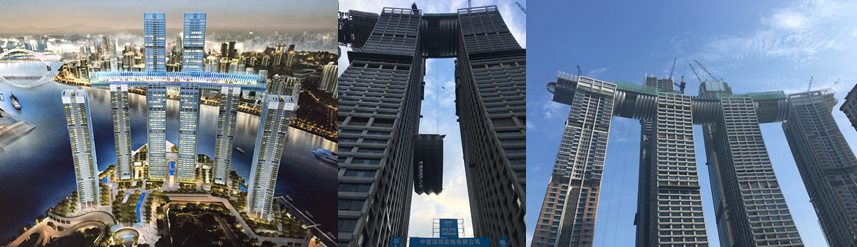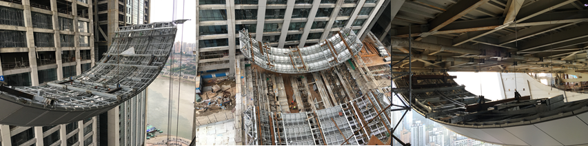 超輕弧形鋁板幕墻系統(tǒng)提升。具有提升高度高(190m)、帶維護(hù)結(jié)構(gòu)重量極輕對(duì)風(fēng)極度敏感、周邊邊界復(fù)雜、局部提升后仍需滑移就位等特點(diǎn)。采用“豎向張緊拉索+水平纜風(fēng)”作為提升抗側(cè)體系,部分靠近塔樓側(cè)幕墻單元采用“提升+高空滑移就位”的安裝方案實(shí)現(xiàn)幕墻系統(tǒng)的高效安裝。