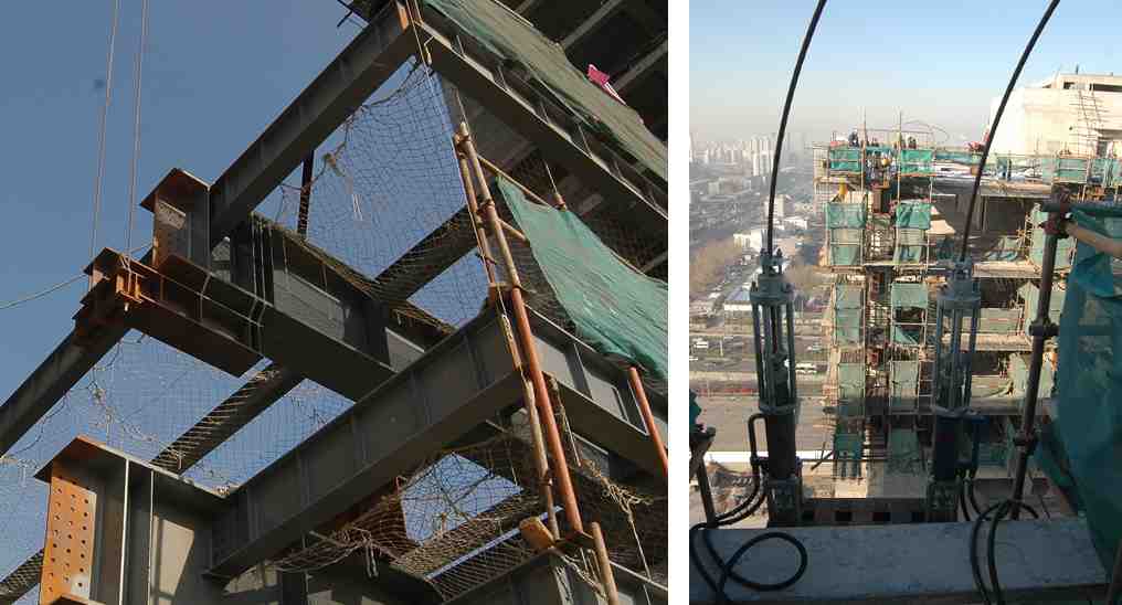 北京科技大學(xué)鋼結(jié)構(gòu)連廊共分四層,跨度為25.2m。現(xiàn)場(chǎng)若采用高空拼裝,則需搭設(shè)近80m高的腳手架,經(jīng)濟(jì)成本過高;因此采用液壓千斤頂整體提升工藝完成連廊鋼結(jié)構(gòu)施工。實(shí)施時(shí),在標(biāo)高12.5m(3層)處將各層連廊鋼結(jié)構(gòu)加工完成,連廊兩端設(shè)置懸臂梁牛腿,之后通過設(shè)置在懸臂牛腿上的千斤頂將連廊鋼結(jié)構(gòu)整體提升就位。