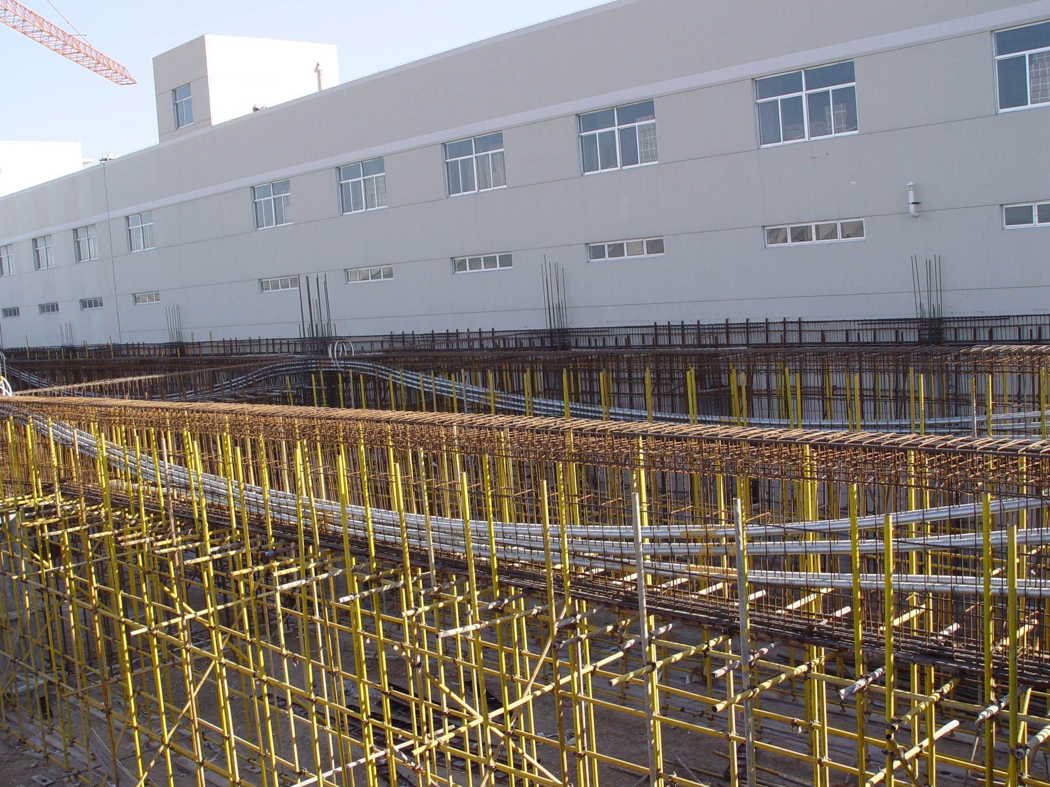預應力設計及施工。大平臺框架主梁及次梁采用了無粘結及有粘結預應力技術,解決大跨重載問題,鋼絞線用量近2000t,完成預應力設計與施工。